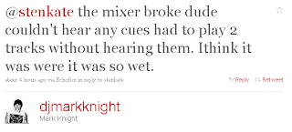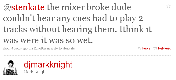 Duidelijk verhaal. Mixer kapot, op naar de vervangende dj-set. Ook al zal ik geen diepgaand contact met hem verkrijgen, het geeft toch de kracht aan van Twitter om op een iets persoonlijker vlak contact te hebben met iemand die over de hele wereld reist en voor massa’s mensen draait.