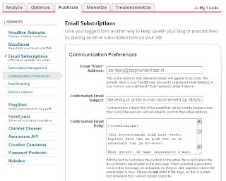 Uiteraard is de nieuwsbrief optie van Feedburner lang niet zo uitgebreid als wat speciale nieuwsbriefprogramma’s (zoals Campaign Monitor of MailChimp, van die laatste maak ik zelf gebruik en schrijf ik binnenkort een stappenplan) je kunnen bieden. Het kan echter een interessante optie zijn omdat het snel is op te zetten en je weinig hoeft te doen om dit automatische proces te laten draaien.