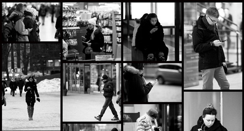 Ook leuk om te zien: de site We never look up. Door de smartphone lijkt iedereen verzonken in de digitale wereld en kijken mensen veel naar beneden.